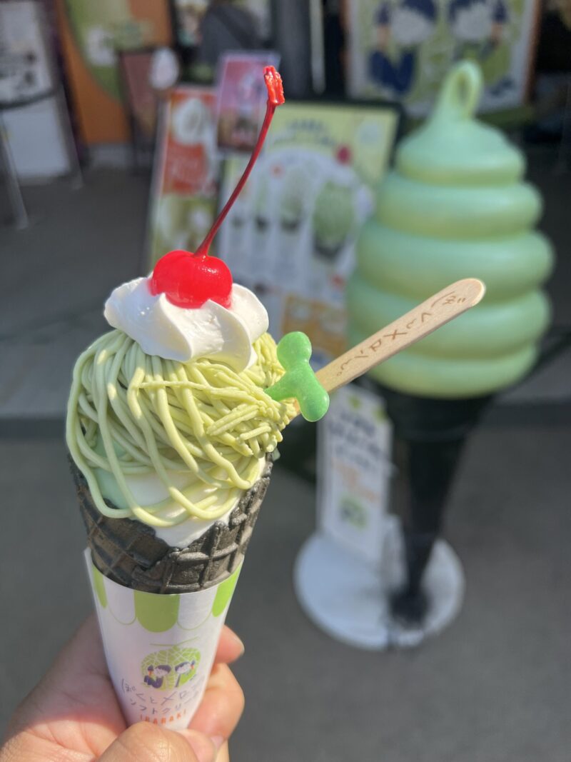 メロメロモンブランソフト(500円) バニラとメロンソフトの上に、メロン風味のモンブランペーストが乗った一品。