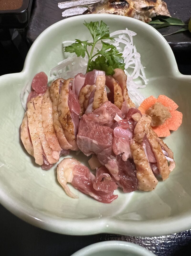 そして、お待ちかねの夕食。 空腹の極みにある私の目の前に現れたのは、鹿児島名物の「鳥刺し(地鶏のタタキ)」。